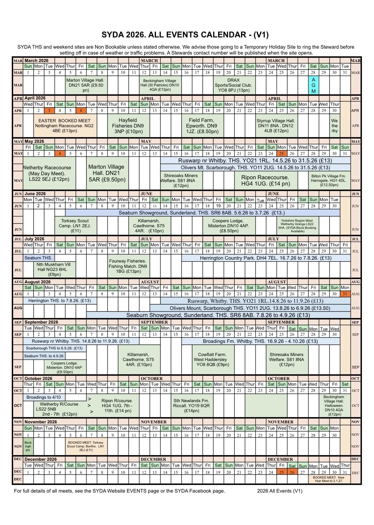 Tap the buttons near the top of this page to see the latest updated versions giving brief details of the 2026 sites dates and locations in A4 printable format.